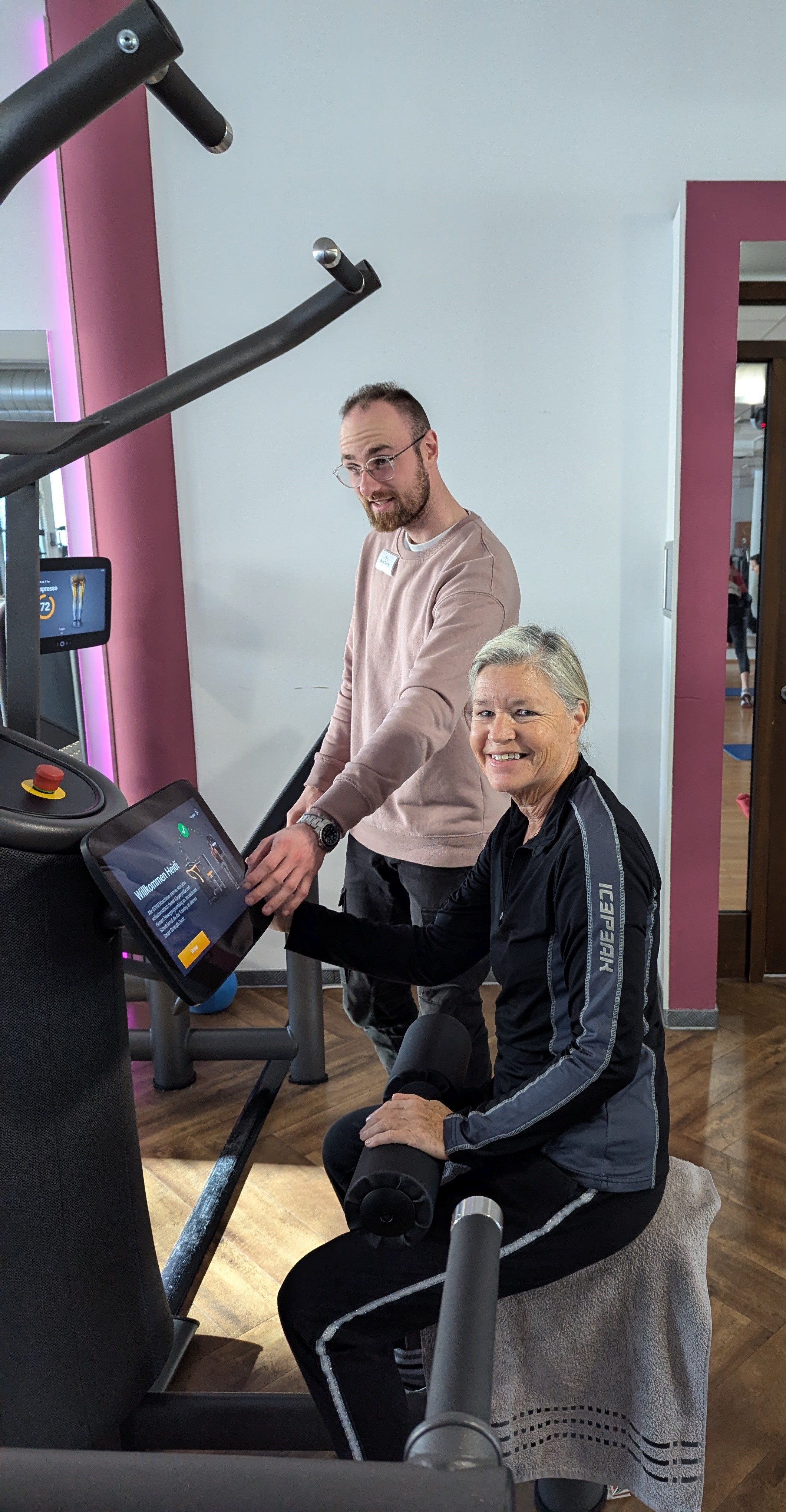 Glücklicherweise bekam ich von einem Bekannten, der auch im Münchner Osten wohnt, den Tipp, mir das „Vitness“-Studio in Feldkirchen anzuschauen, weil dort ein Zirkel mit E-Gym-Geräten angeboten wird, die anders seien als „normale“ Geräte. Meine Neugier war geweckt. Ich erwischte mit Domi sogar einen Trainer, der leidenschaftlich gern Golf spielt! Das war schon die halbe Miete. Dann testete er an einem speziellen Messgerät meine Beweglichkeit und was war das Ergebnis? Mein Bio-Alter ist 60 statt der amtlichen 67 Jahre!
