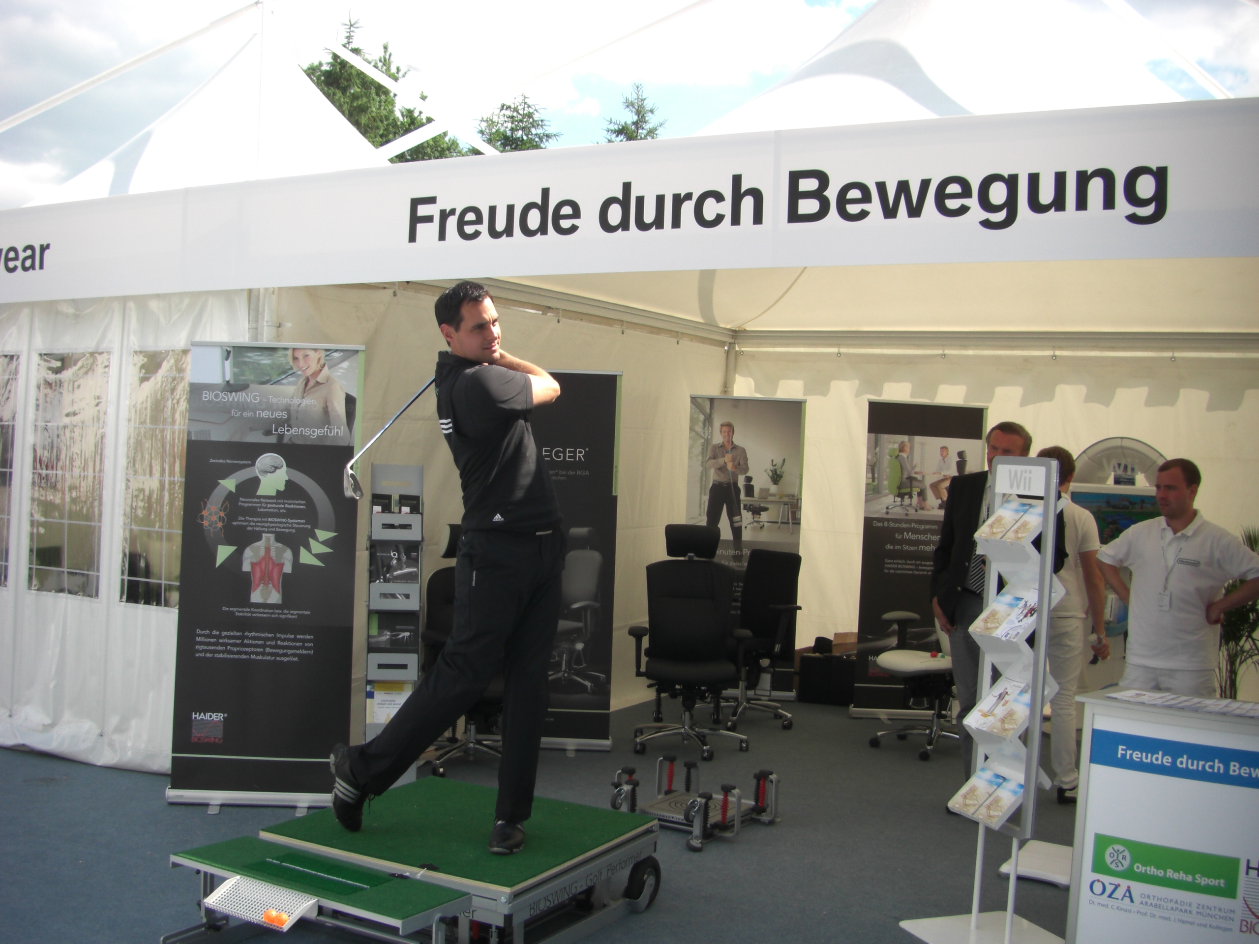 Das blüht die Psyche regelrecht auf. Die halte ich sowieso für enorm wichtig. Streicheleinheiten für die Seele beschleunigen den Heilungsprozess ungemein. Dazu natürlich etwas mehr als Streicheleinheiten vom Physiotherapeuten. Er weiß, wo es noch hapert, wo noch Schwachpunkte sind. Man wiegt sich ja relativ bald in Sicherheit. Der Alltag geht wieder problemlos. Aber gezielte Übungen, die man freiwillig nicht machen würde, bringen einen wieder auf den Boden der Tatsachen: Oha, da spielt ein Muskel doch noch nicht so mit… Ist es wieder der Piriformis? Ich lasse da momentan im Golfclub Personal Trainerin Lena an mich ran: Mit ihr mache ich das Elektro-Muskel-Stimulationstraining (EMS) von Miha Bodytec (www.miha-bodytec.com), das so intensiv ist, dass 20 Minuten Training genügen, um einen ordentlichen Muskelkater zu haben. Mal sehen, was das für einen Effekt bringt, wenn auch in Deutschland die Golfsaison wieder losgeht. In Italien sind mir jedenfalls schon etliche Pars gelungen – das ist auch nötig, um wieder mein Handicap 16.5 zu spielen.