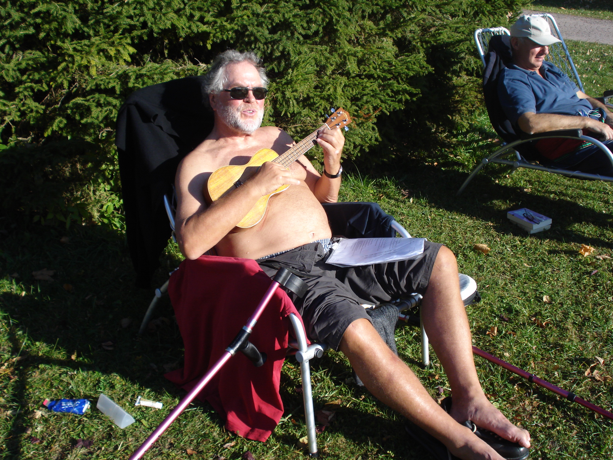Gut gelaunter Hüft-Patient mit Ukulele im November (!) im Klinikgarten von St. Hubertus am Tegernsee.