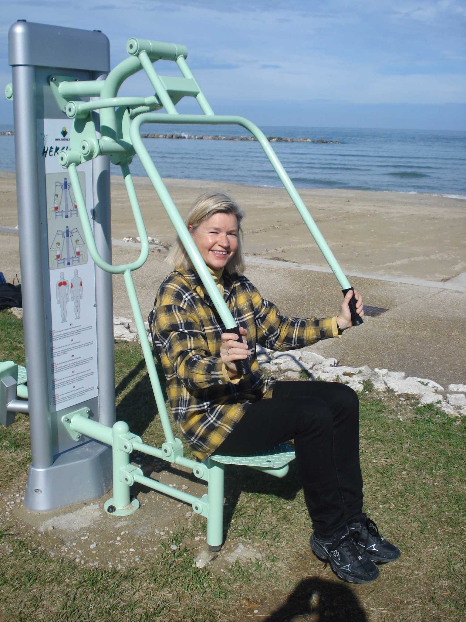 Um das schlechte Fitness-Gewissen der Italiener zu beruhigen, die traditionell eher der passeggiata, dem lockeren Flanieren zugeneigt sind (es sei denn sie erklimmen im quietschbunten Hauteng-Dress per Rennrad die marchegianischen Hügel), hat man bei uns an der Adria doch tatsächlich Fitnessgeräte am Strand aufgestellt. Wir probierten sie über Ostern aus – siehe Foto – und kamen zu dem Schluss, dass sie deutschen TÜV-Prüfern sicher nicht standhalten würden. Immerhin heißen sie hübsch Hercules!