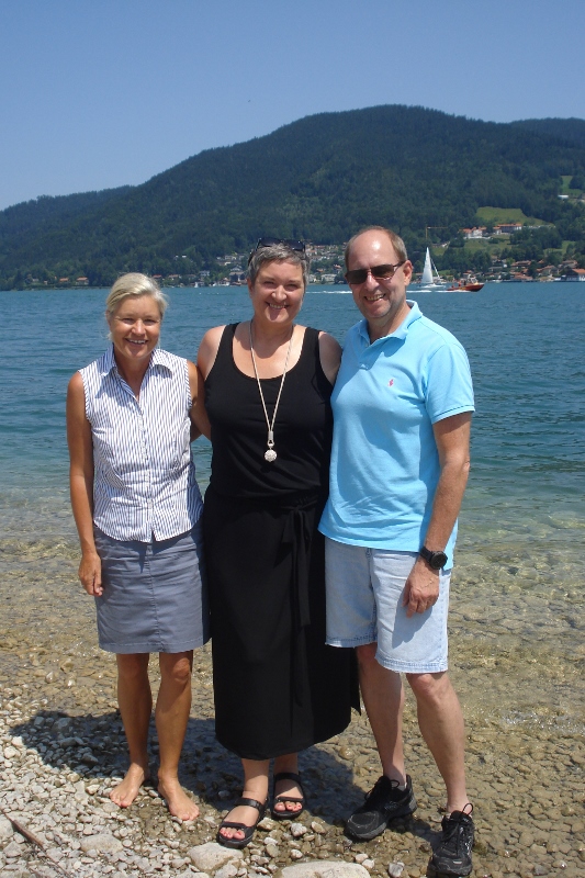 Nun haben wir Cory aus Hong Kong in ihrer Reha in der Medical Park Klinik St. Hubertus in Bad Wiessee am Tegernsee besucht – und können somit ein 6er TEP-Treffen vermelden! Denn sowohl mein Mitautor Peter Herrchen als auch Cory und ich haben ja je zwei Hüft-TEPs. Beim „Foto-Shooting“ war ich allerdings die Einzige, die ihre Schuhe ausgezogen hat, um am heißen 35-Grad-Tag Abkühlung im Tegernsee zu genießen. Den beiden anderen war der Untergrund zu steinig! Da lobe ich mir doch das Training auf unebenem Untergrund und die Freude am Barfußgehen. Das ist kostenlose Fußreflexzonenmassage – und erspart Einlagen.